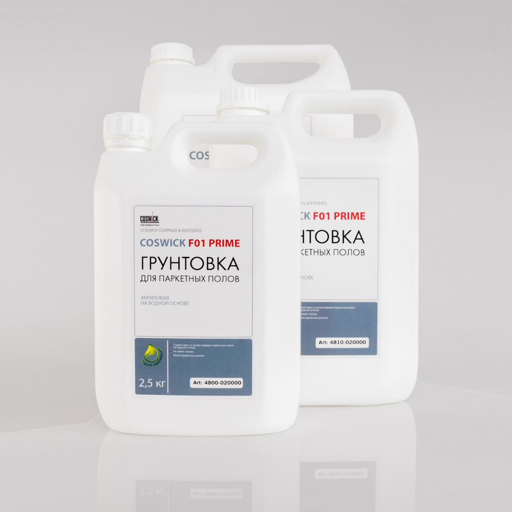 Акриловая грунтовка Coswick F01 Prime на водной основе предназначена для нанесения в качестве первого слоя лакового покрытия на паркетные, пробковые и дощатые полы всех пород древесины внутри помещений. Грунтовка усиливает адгезию последующих слоев лака и способствует получению более ровного финишного покрытия.