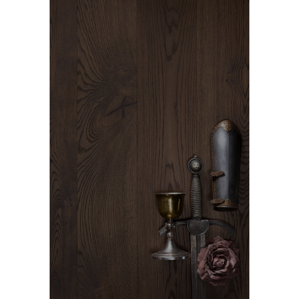 Трехслойная инженерная доска Coswick Дуб ЭДИНБУРГ шириной 190 мм в селекции Черектер характеризуется умеренно контрастной вариацией цвета. Присутствуют заболонь, прожилки, свилеватость, отреставрированные сучки любых размеров, пластевые и торцевые трещины, червоточины. Реставрация выполняется с художественным подходом: максимально сохраняется первозданный вид сучков, для заполнения используется шпатлевка с древесной составляющей. Поверхность имеет достаточно однородный тон и текстуру, сучки и прочие неоднородности трудно различимы на темном фоне и подчеркивают натуральность дубовых паркетных полов.