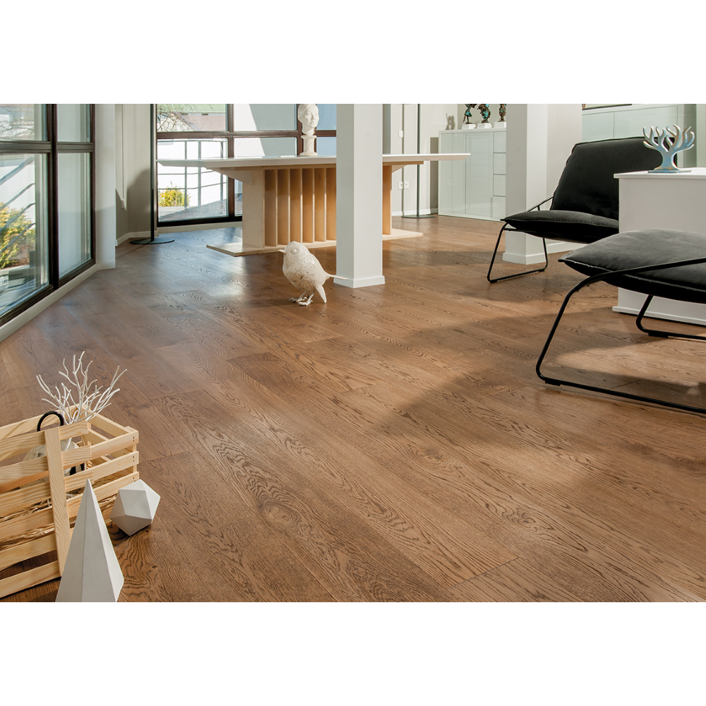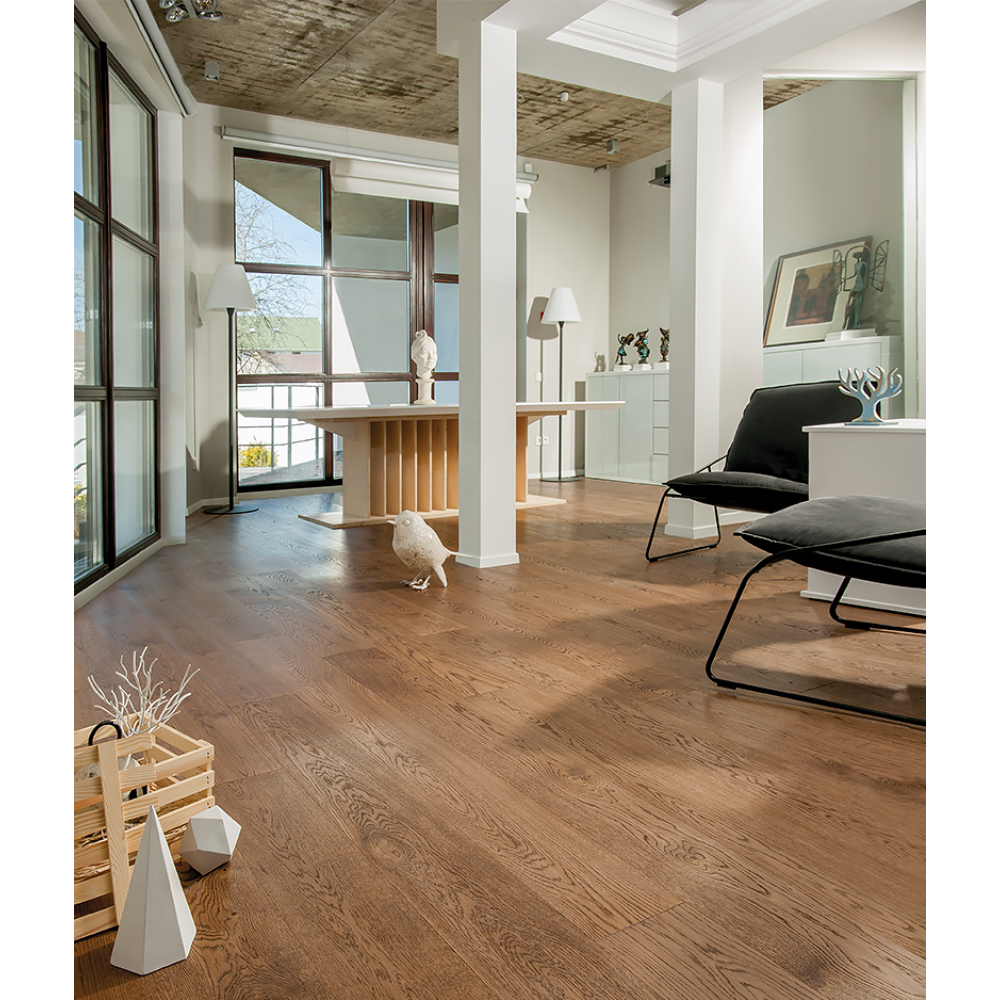 Трехслойная инженерная доска Coswick Дуб КЕДР шириной 190 мм в селекции 1 Натур характеризуется умеренной вариацией цвета. Присутствуют неконтрастная заболонь, прожилки и иные незначительные дефекты. Отреставрированные сучки размером до 35 мм. Поверхность имеет достаточно однородный тон и текстуру, сучки и прочие неоднородности практически не различимы.