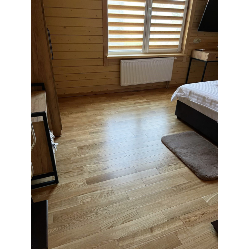 Дубовый паркет первого сорта. Планки с разнообразной текстурой и распилом, без резких перепадов по цвету. Допускаются светлые и темные сучки размером до 20мм, неконтрастная заболонь.