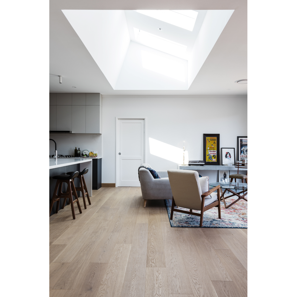 Трехслойная инженерная доска Coswick Дуб ВАНИЛЬНЫЙ шириной 190 мм в селекции 1 Натур характеризуется умеренной вариацией цвета. Присутствуют неконтрастная заболонь, отреставрированные сучки размером до 35 мм, прожилки и иные незначительные дефекты. Реставрация выполняется с художественным подходом: максимально сохраняется первозданный вид сучков, для заполнения используется шпатлевка с древесной составляющей. Поверхность имеет достаточно однородный тон и текстуру, аккуратные сучки мягко подчеркивают натуральность и солидность дубовых паркетных полов.