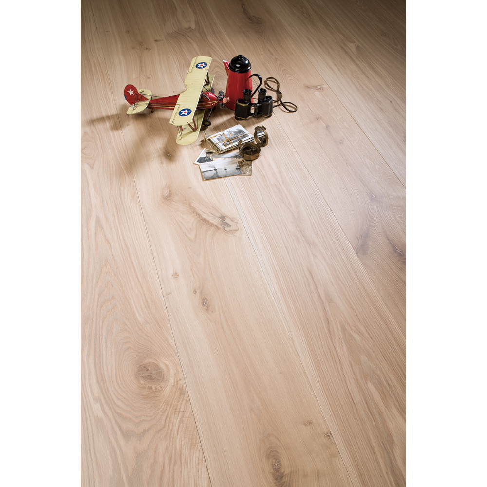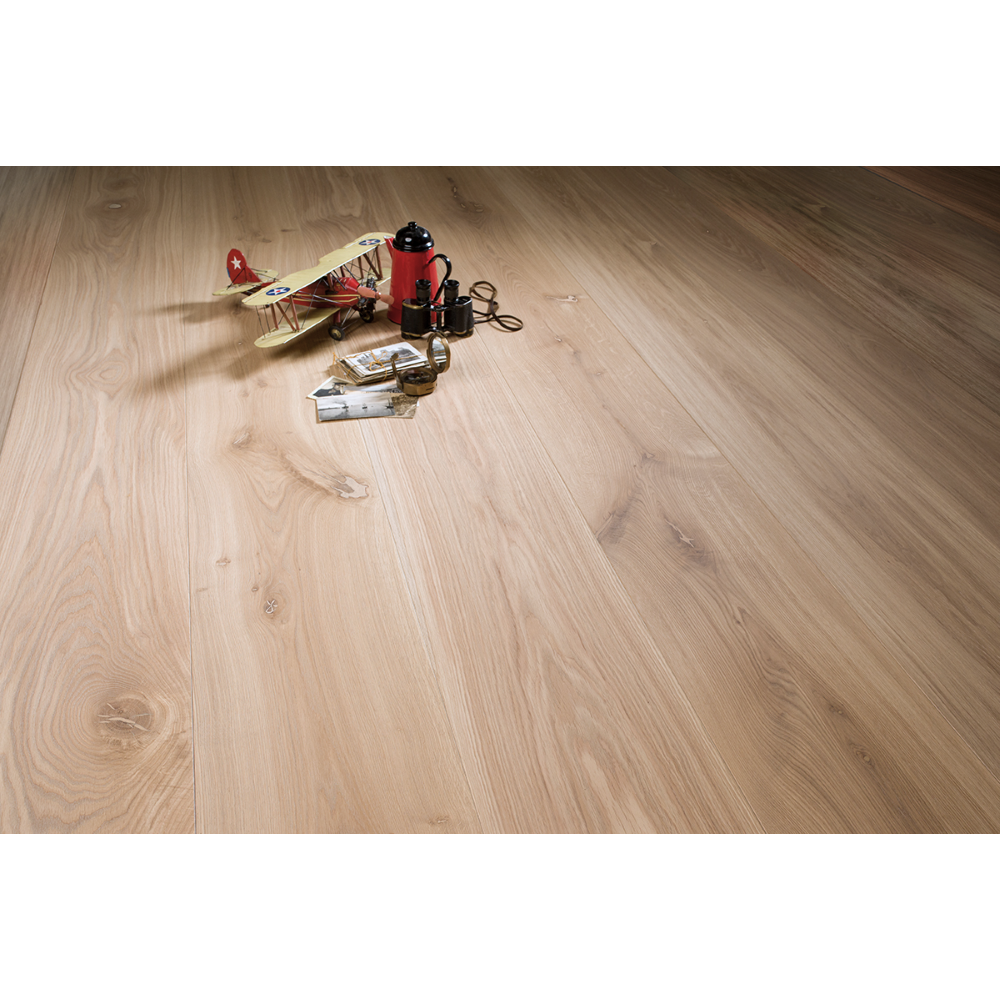 Широкоформатная инженерная доска Coswick Дуб ВАНИЛЬНЫЙ РУСТИКАЛЬНЫЙ шириной 300 мм в селекции Черектер характеризуется умеренно контрастной вариацией цвета. Присутствуют заболонь, прожилки, свилеватость, отреставрированные сучки любых размеров, пластевые и торцевые трещины, червоточины. Реставрация выполняется с художественным подходом: максимально сохраняется первозданный вид сучков, для заполнения используется шпатлевка с древесной составляющей. Поверхность имеет достаточно однородный тон и текстуру, сучки мягко подчеркивают натуральность и солидность дубовых паркетных полов.