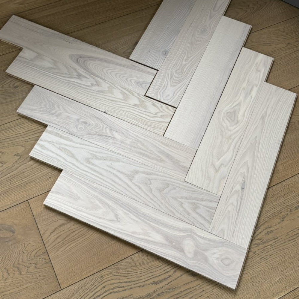 Английская елка Coswick Ясень ЛУННЫЙ СВЕТ шириной 127 мм в селекции 1 Коммон характеризуется умеренно контрастной вариацией цвета. Присутствуют неконтрастная заболонь, прожилки и свилеватость, отреставрированные сучки до 25 мм и иные незначительные дефекты. Поверхность имеет достаточно однородный тон и текстуру, сучки и прочие неоднородности слабо различимы.