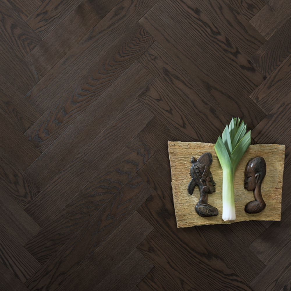 Английская елка Coswick Ясень МОККА шириной 127 мм в селекции 1 Коммон характеризуется умеренно контрастной вариацией цвета. Присутствуют неконтрастная заболонь, прожилки и свилеватость, отреставрированные сучки до 25 мм и иные незначительные дефекты. Поверхность имеет достаточно однородный тон и текстуру, сучки и прочие неоднородности слабо различимы.