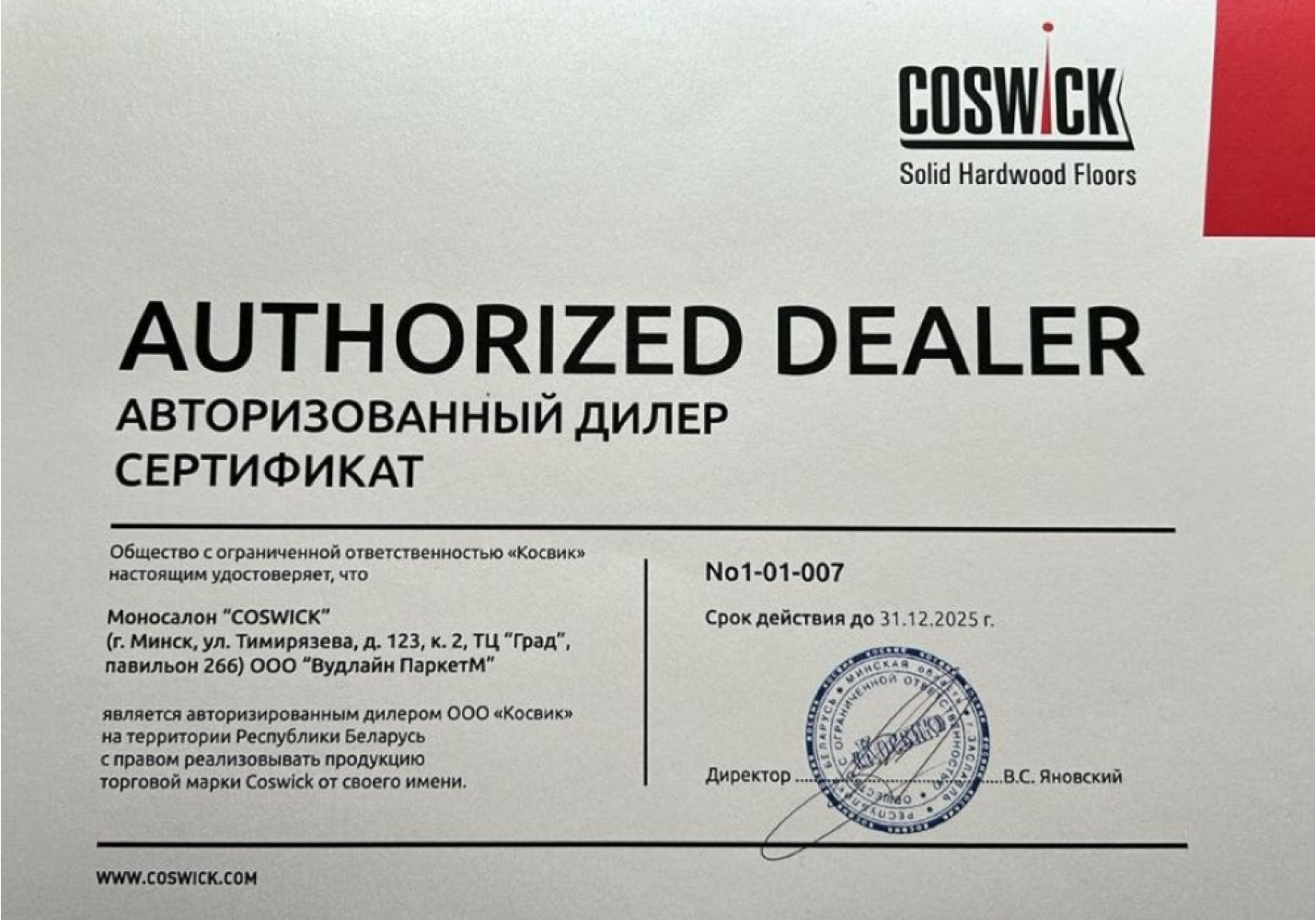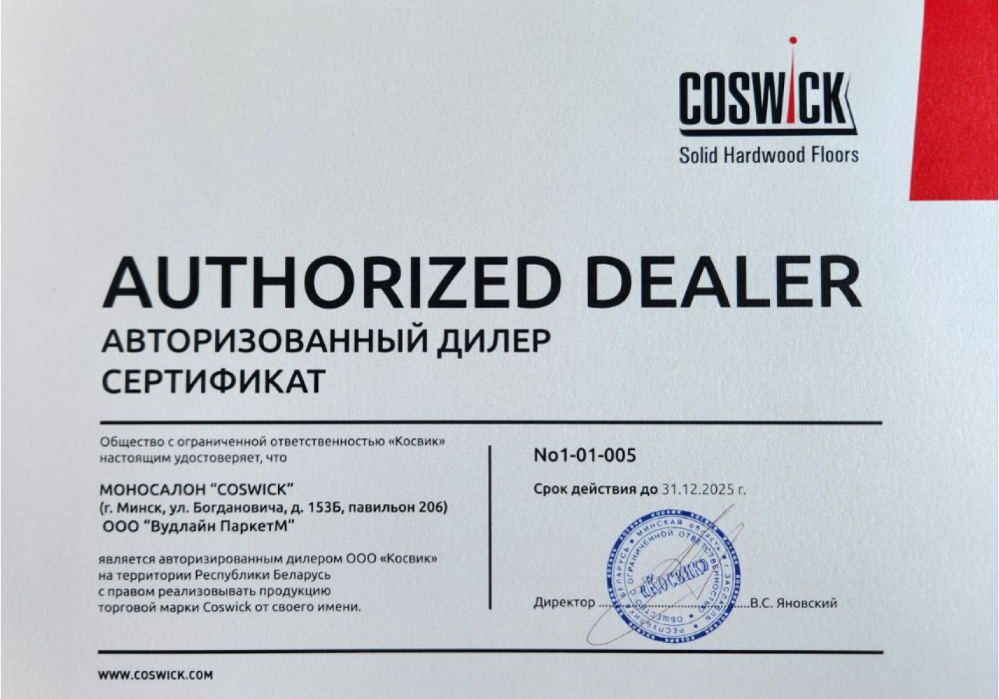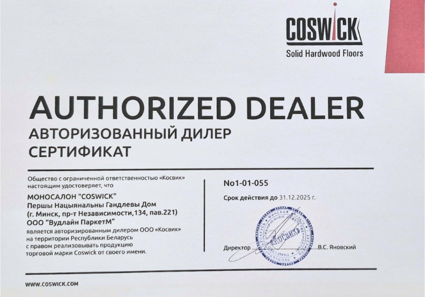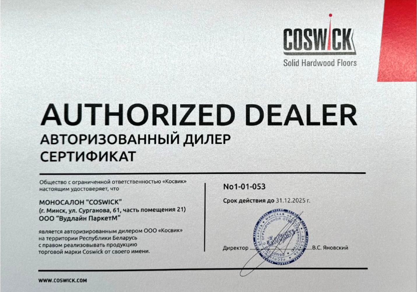 Уже 16 лет (с 2009 года) наша компания ООО "Вудлайн ПаркетМ" является авторизованным дилером ООО "Косвик" на территории Республики Беларусь. Наши Моносалоны Coswick в Минске ежегодно подтверждают и пролонгируют этот статус.